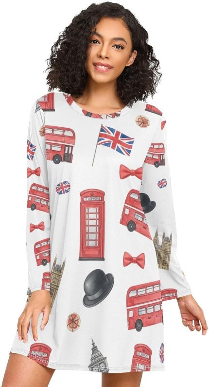 Womens Nightgown, Lounge Pajama Sleep Dress, Long Sleeve Night Shirts for Woman, Watercolor London Symbols