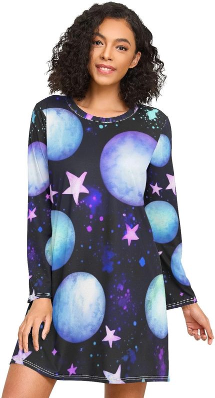 Womens Sleep Shirts, Long Sleeve Womens Nightgown, Casual Pajama Sleep Dress for Fall, Watercolor Planets