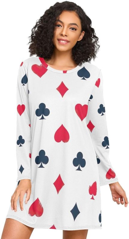Womens Sleep Shirts, Long Sleeve Womens Nightgown, Comfortable Ladies Night Dress for Autumn, Grunge Card Suits White