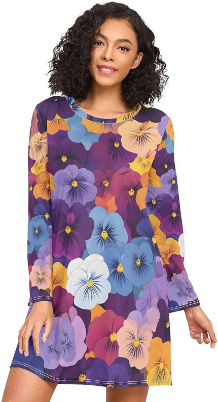 Womens Sleep Shirts, Long Sleeve Womens Nightgowns, Loose House Dress for Autumn, Retro Flower Colorful