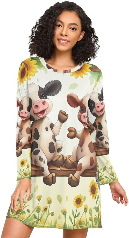 Womens Sleep Shirts, Long Sleeve Womens Nightgowns, Lounge Sleepwear for Fall, Cute Cows Swing Sunflowers