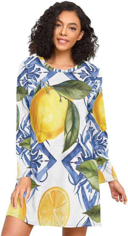 Womens Sleepshirt, Long Sleeve Womens Nightgowns, Soft Sleep Dress for Fall, Sicilian Lemon White Blue