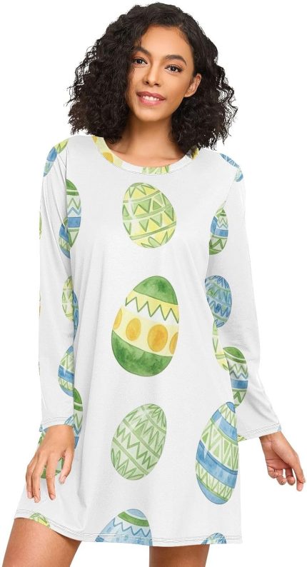 Womens Sleep Shirts, Long Sleeve Womens Nightgown, Loose Pajama Dress for Fall, Blue Green Easter Eggs White