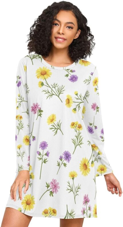 Colorful Wildflowers Long Sleeve Night Shirts for Women, Cozy Crewneck Sleep Dress, Lounge Nightgowns for Women