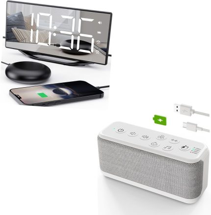 OnLyee Sleep & Wake Bundle: Vibrating Alarm Clock for Heavy Sleepers + Rechargeable White Noise Machine – Dual Alarms, 42 Soothing Sounds, LED Mirror & Office Privacy