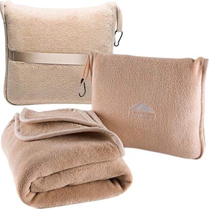 BlueHills Premium Soft Travel Blanket Pillow Airplane Blanket Packed in Soft Bag Pillowcase with Hand Luggage Belt Backpack Clip Compact Pack Large Portable Flight Throw Beige T005