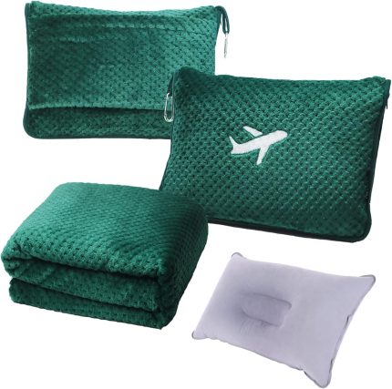 3 in 1 Travel Blanket Pillow Set – 350 GSM Thick Travel Blanket Airplane Compact with Bag, Soft Bag with a Pocket, Inflatable Travel Pillow for Camping & Car Trip (Dark Green)